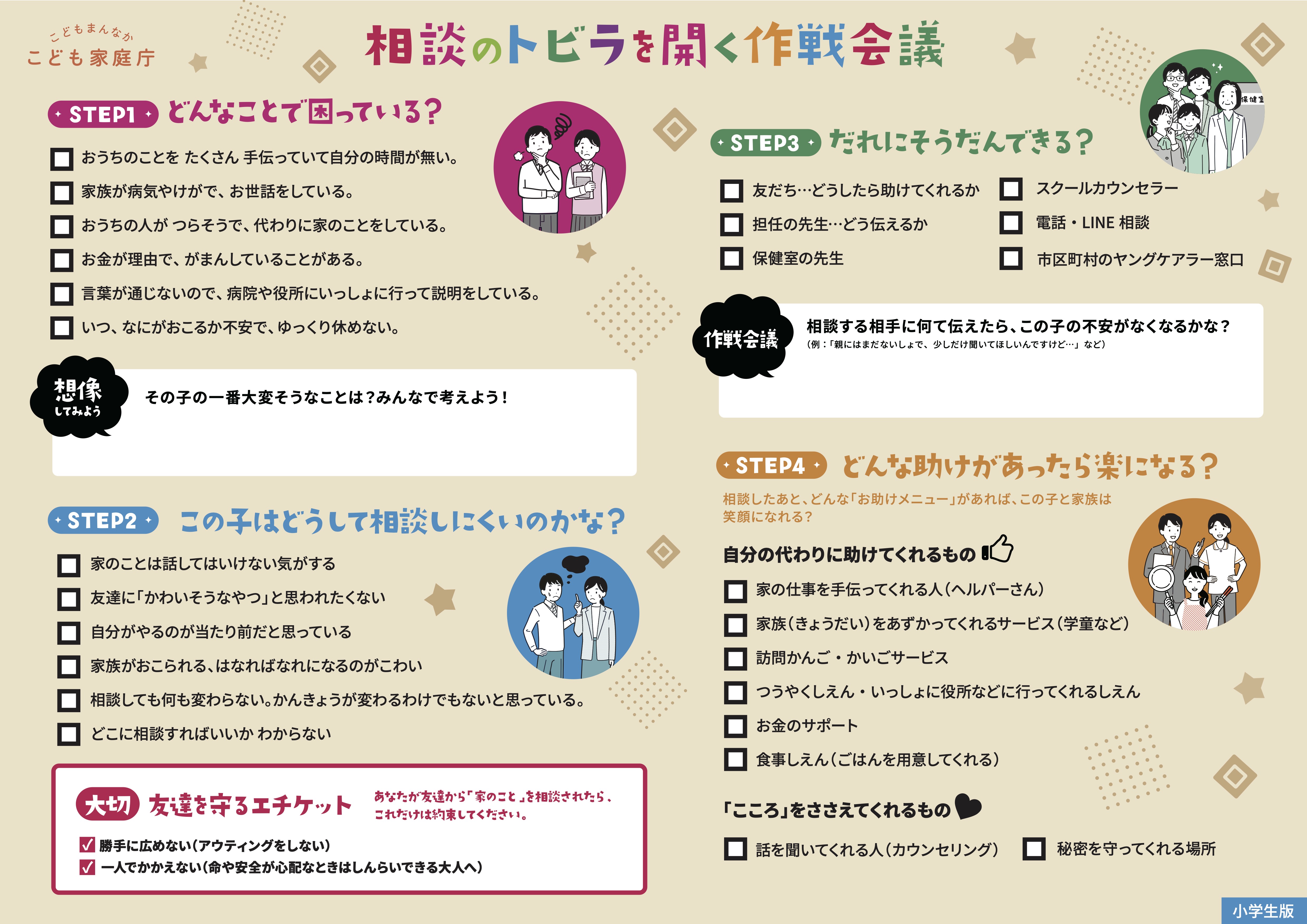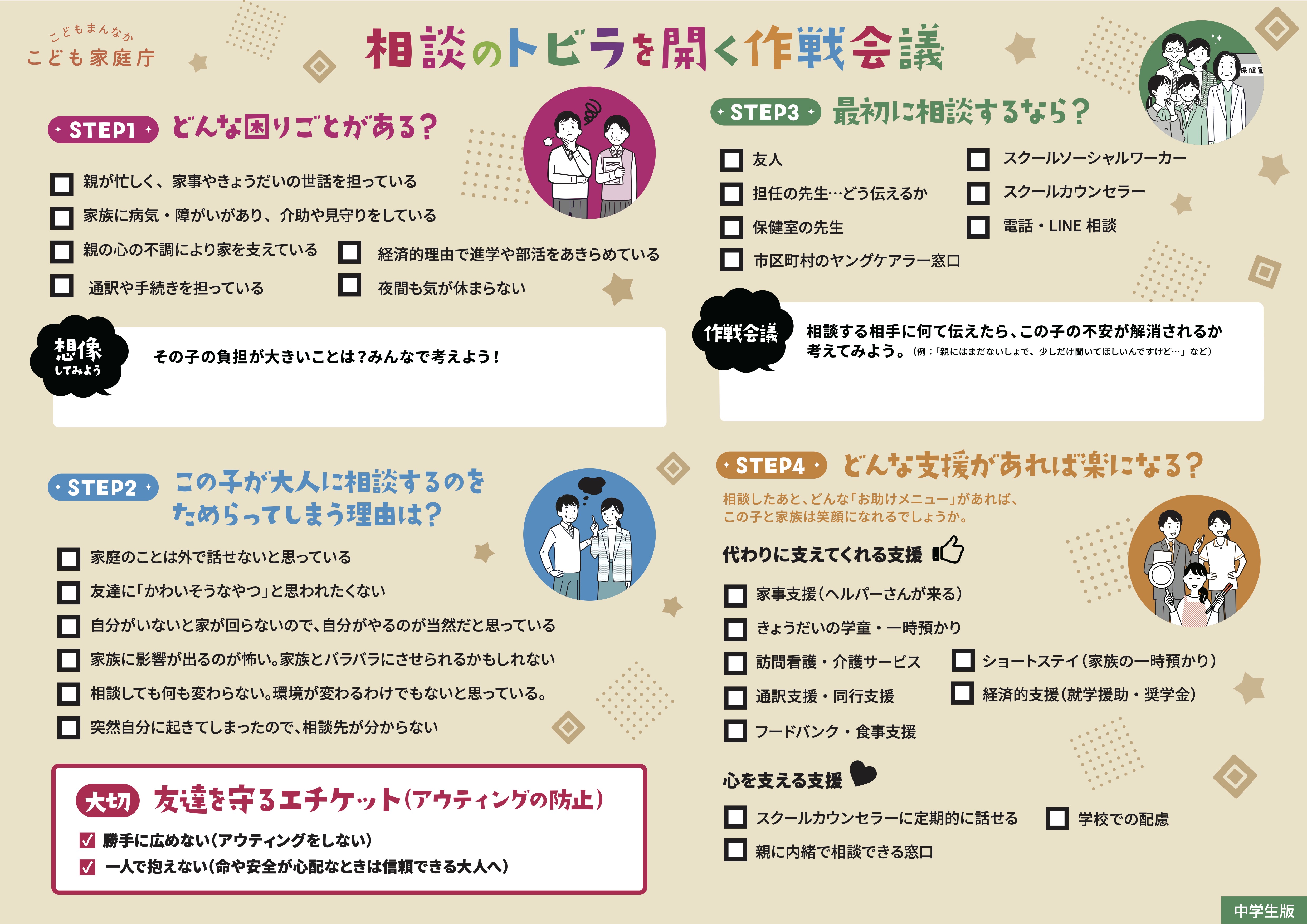 また、「ヤングケアラー」という言葉は、大人が児童生徒を理解するための言葉であり、児童生徒に自覚を迫るために使わないよう配慮をお願いします。